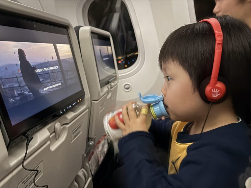 以前、中耳炎になったことがあるため、離着陸時には耳抜きを促すためにジュースを飲ませています。客室乗務員さんに事情を話したところ、ペットボトルに入ったアップルジュースを追加でいただけたのも、子連れには大変助かるサービスでした!