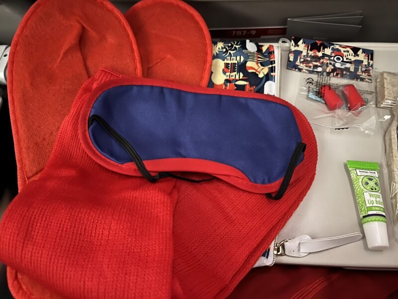 おしゃれなポーチの中に、靴下、アイマスク、リップクリーム、ティッシュ、耳栓など、長距離フライトに役立つアイテムが充実していました。