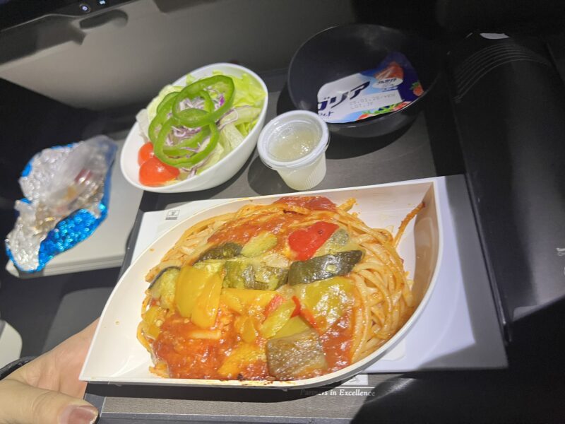 【夕食】 大人の機内食はもちろん、子ども用の機内食はパスタで提供され、息子もパクパクと美味しそうに完食しました。
