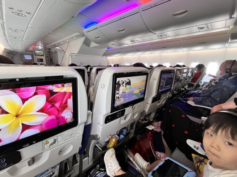 しかもイーロン・マスク氏率いるスペースX社の衛星通信、最新の爆速スターリンクを導入しているため、機内とは思えないほどスムーズな通信が可能です。さらにエコノミークラス含め、全席モニターも完備されているため、子供はアニメ、大人はスマホで情報収集や仕事の連絡、という使い分けが自由自在です。