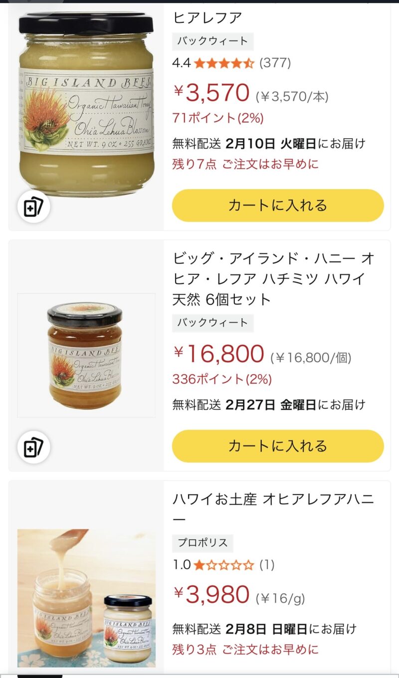 他にも白いハチミツは売っているのですが、一度、「オヒア レフア」というハチミツで失敗したことがあり、「レア ハワイアン」と比較したからなのか、絶賛するほど美味しいハチミツとは感じませんでした。(不味くはないんですよ)
